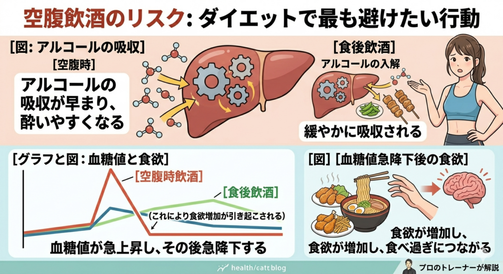 ダイエット時にお酒を飲む場合は、この「脂肪燃焼が一時的に止まりやすい」という点を理解しておくことが重要です。