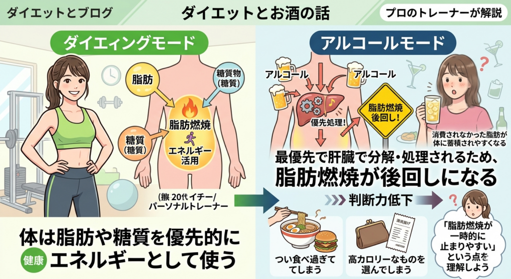 本来であれば、体は脂肪や糖質をエネルギーとして使いますが、飲酒後はアルコールの分解が優先されるため、脂肪が使われにくくなります。